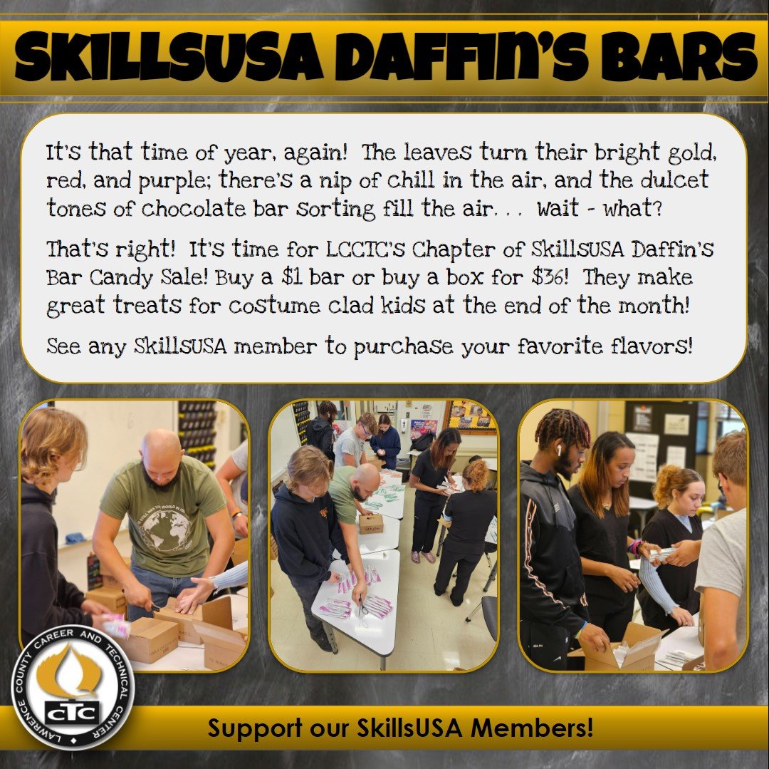 That’s right! It’s time for LCCTC’s Chapter of SkillsUSA Daffin’s Bar Candy Sale! Buy a $1 bar or buy a box for $36! They make great treats for costume-clad kids at the end of the month!
