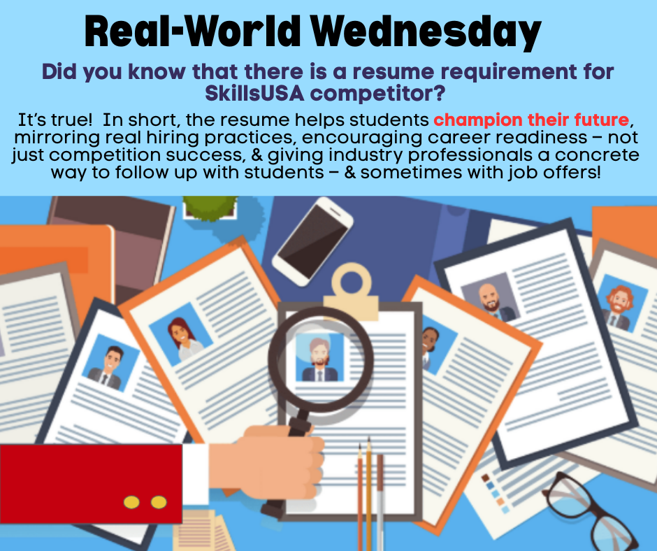 Wednesday's focus during SkillsUSA is REAL-WORLD WEDNESDAY. Today, we celebrate one way SkillsUSA helps our students prepare themselves to be job-ready: by requiring every competitor to submit a resume.